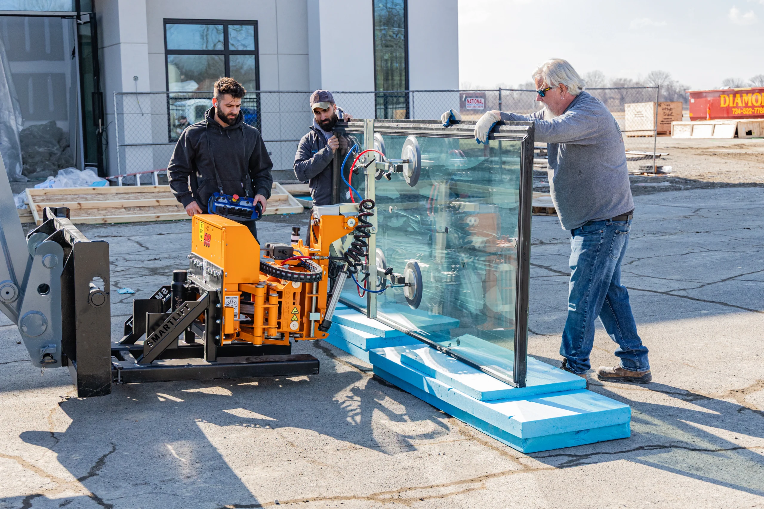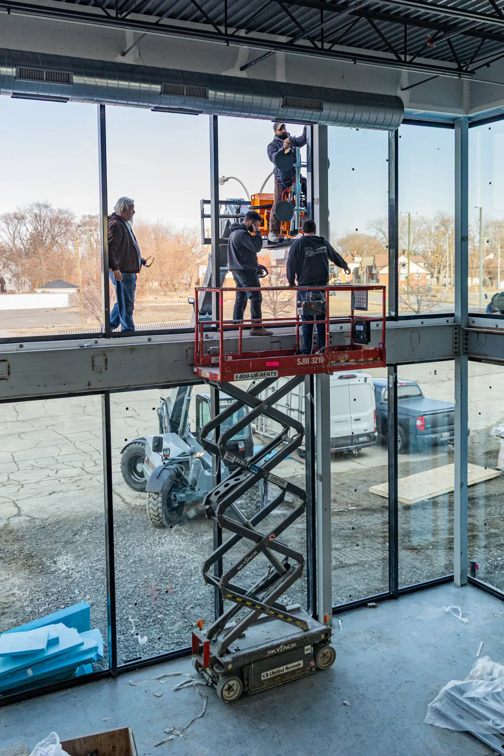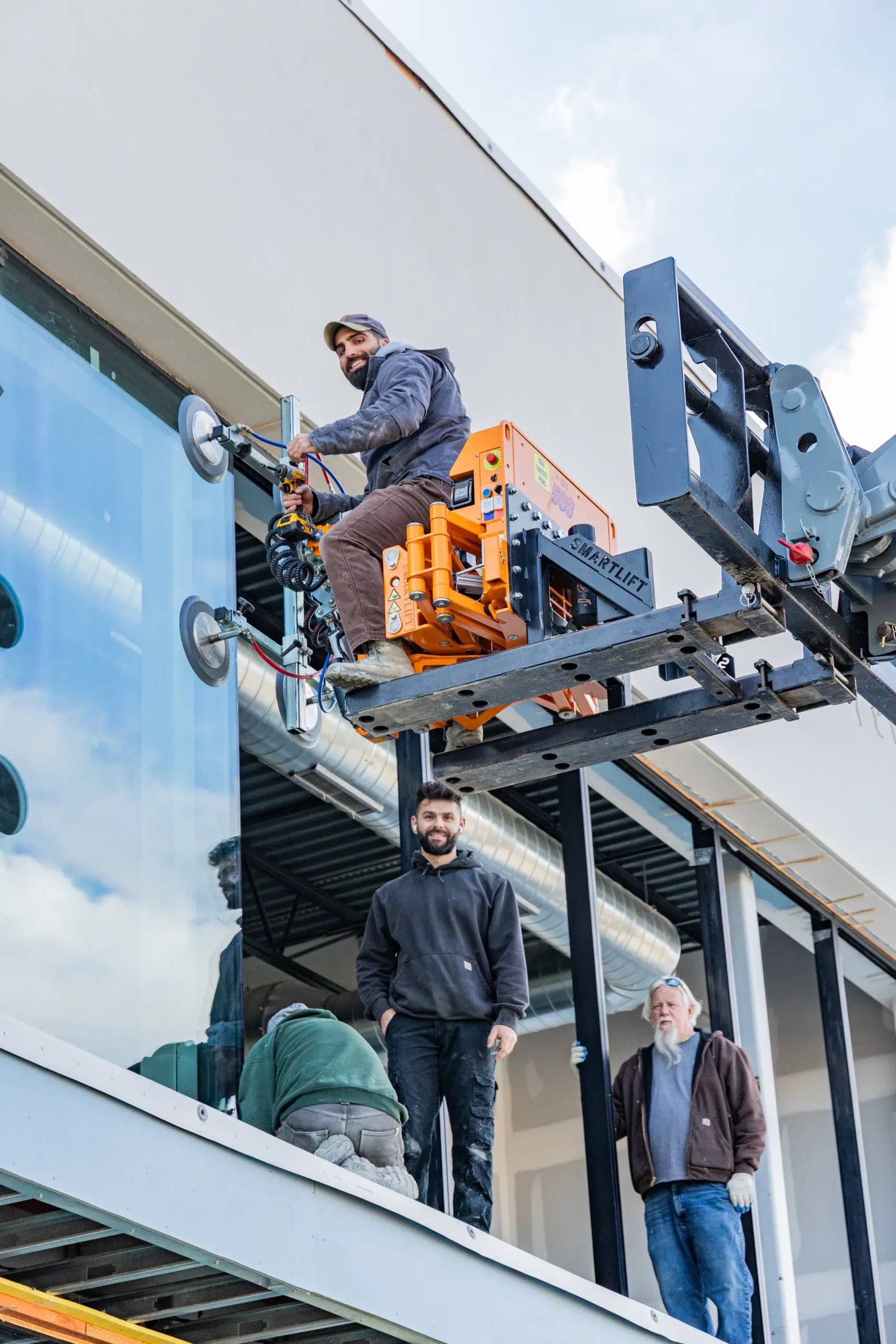 Exterior glass installation requires precision and specialized equipment to safely lift and align large panels.