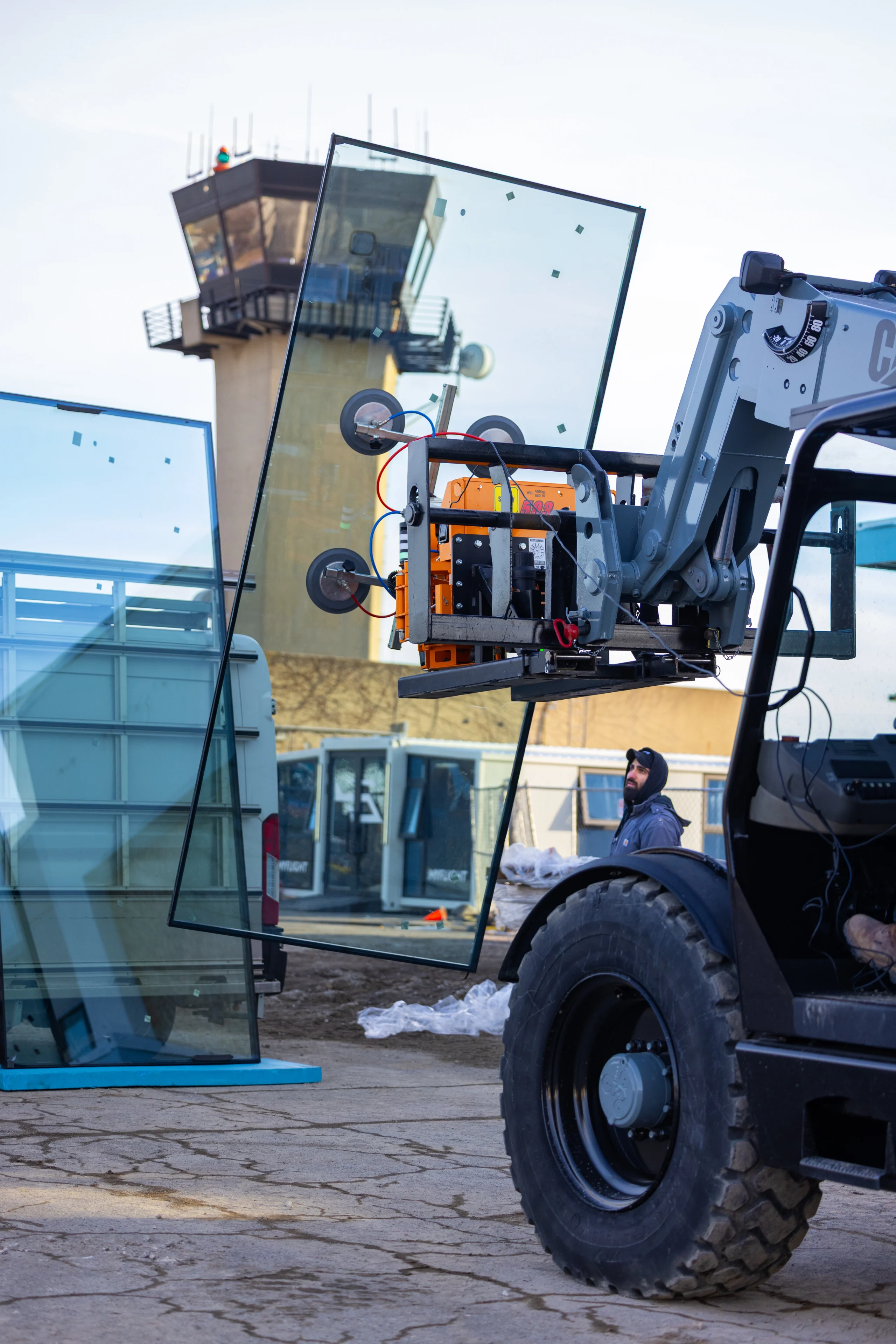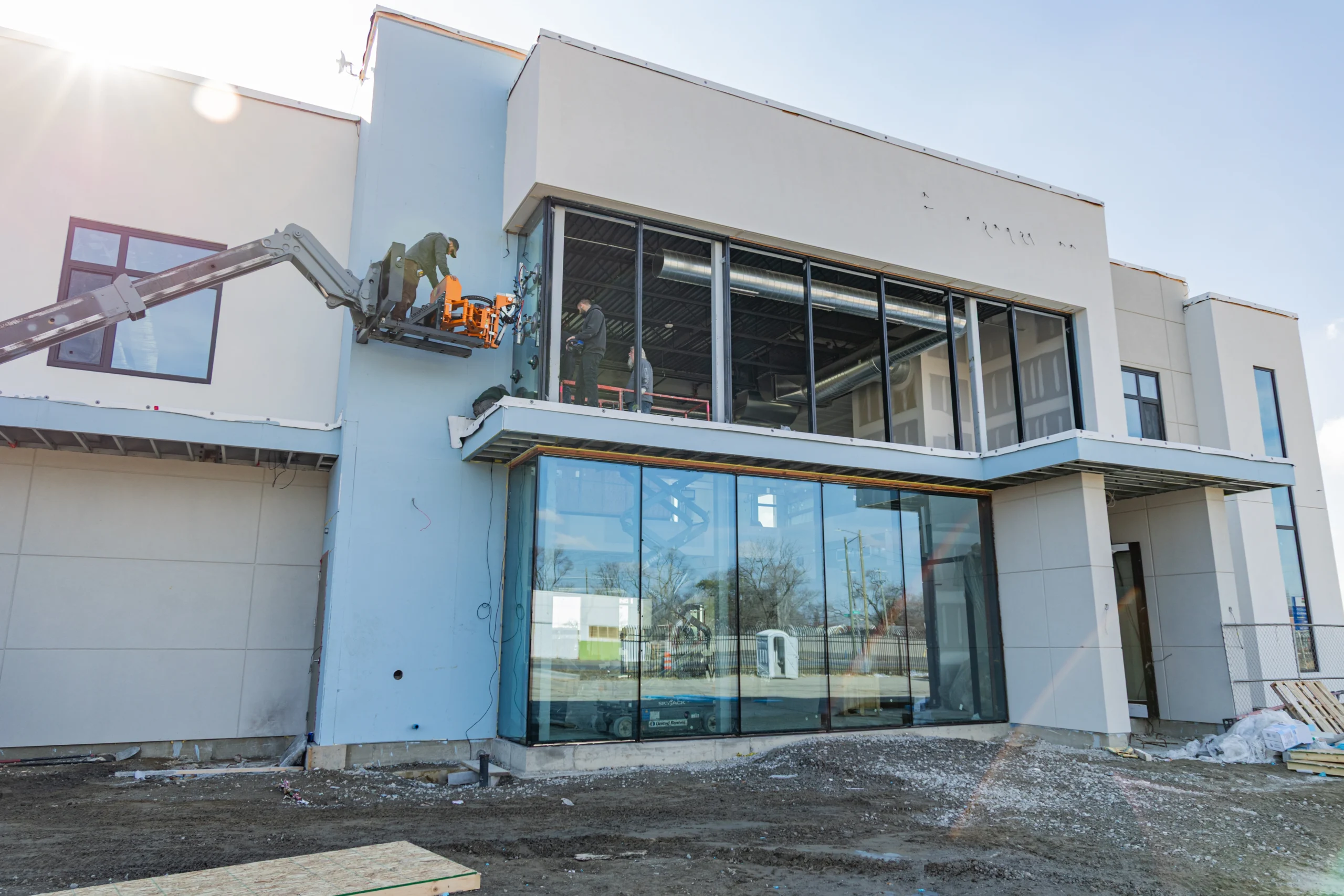 Using specialized lifting equipment with suction mounts, crews carefully positioned and secured the glass sections into place. These panels will allow natural light into the interior while giving the building a modern and open appearance.