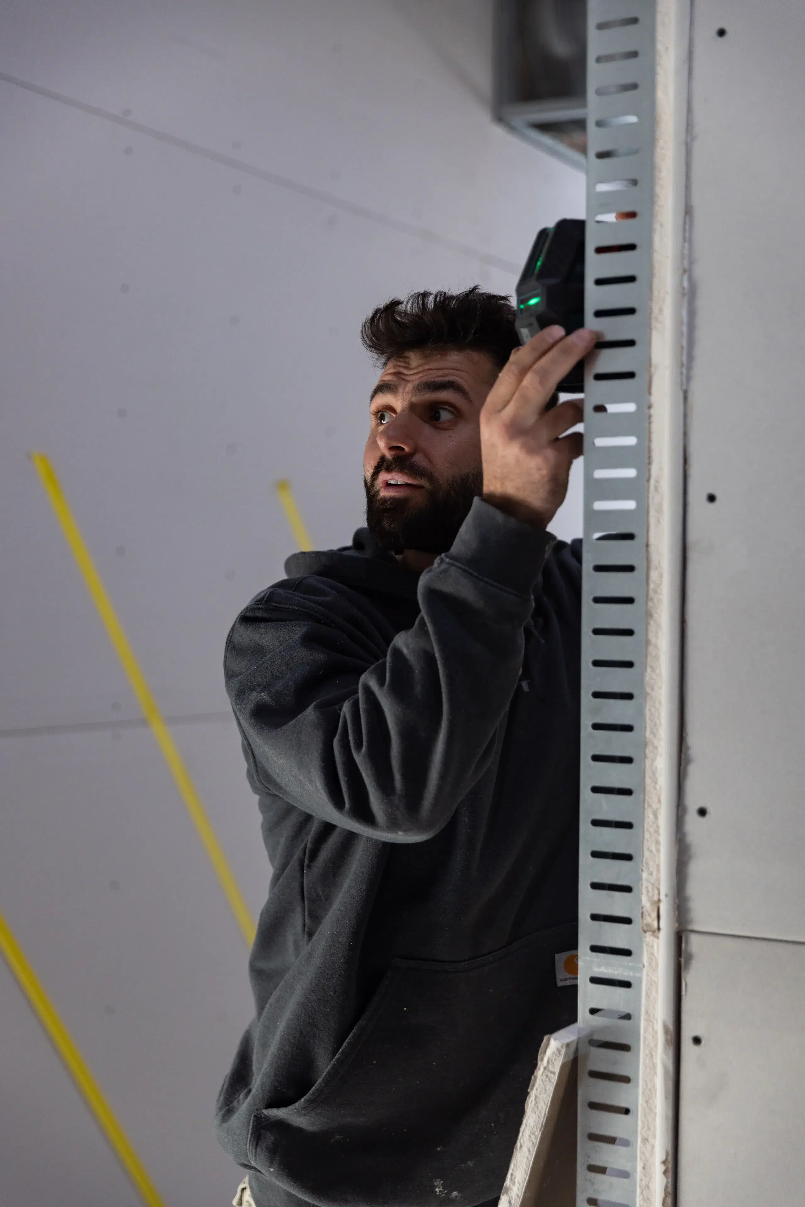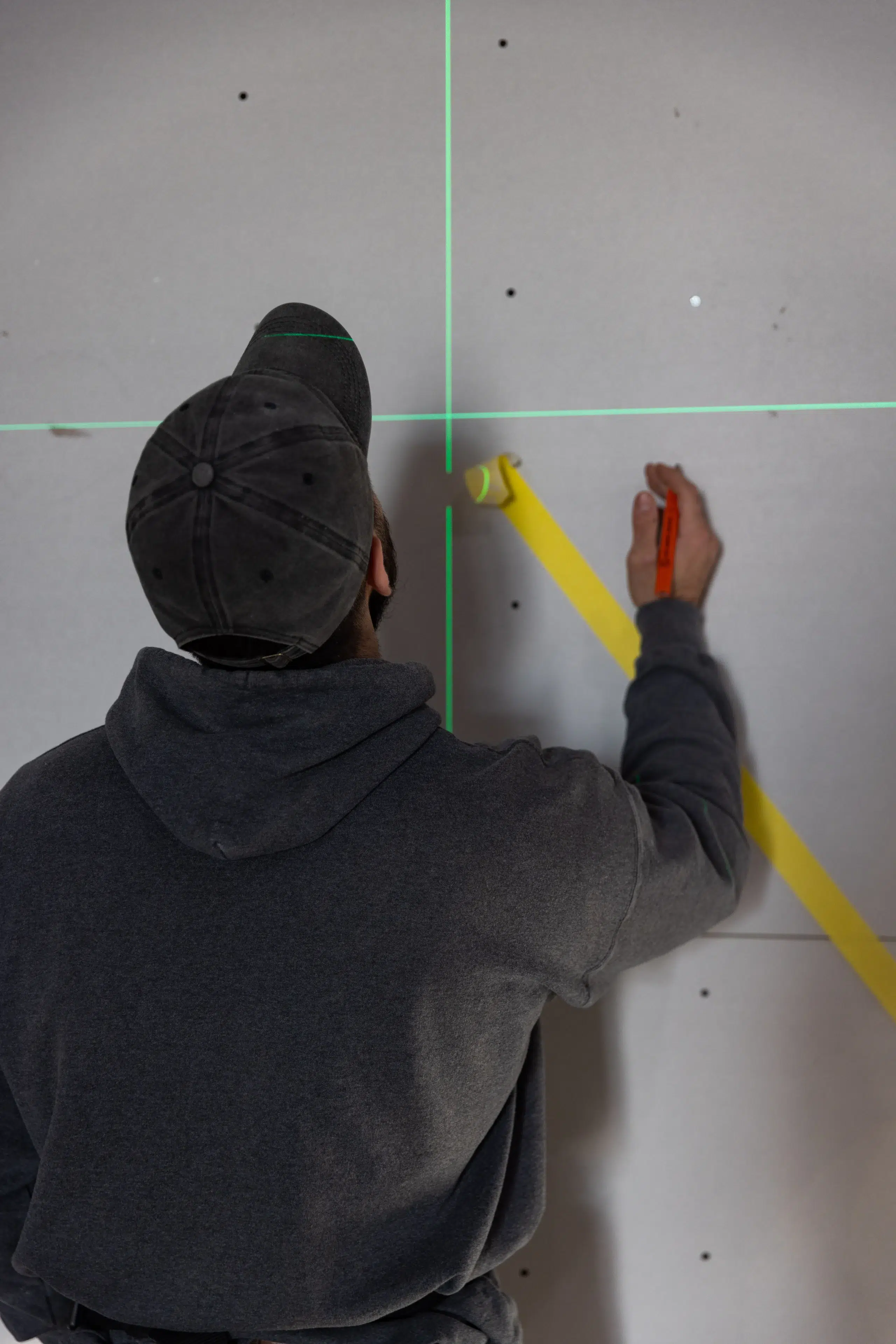 Using laser levels and measuring tools, the construction team carefully mapped out wall lines, mounting points, and panel alignment before securing materials permanently.