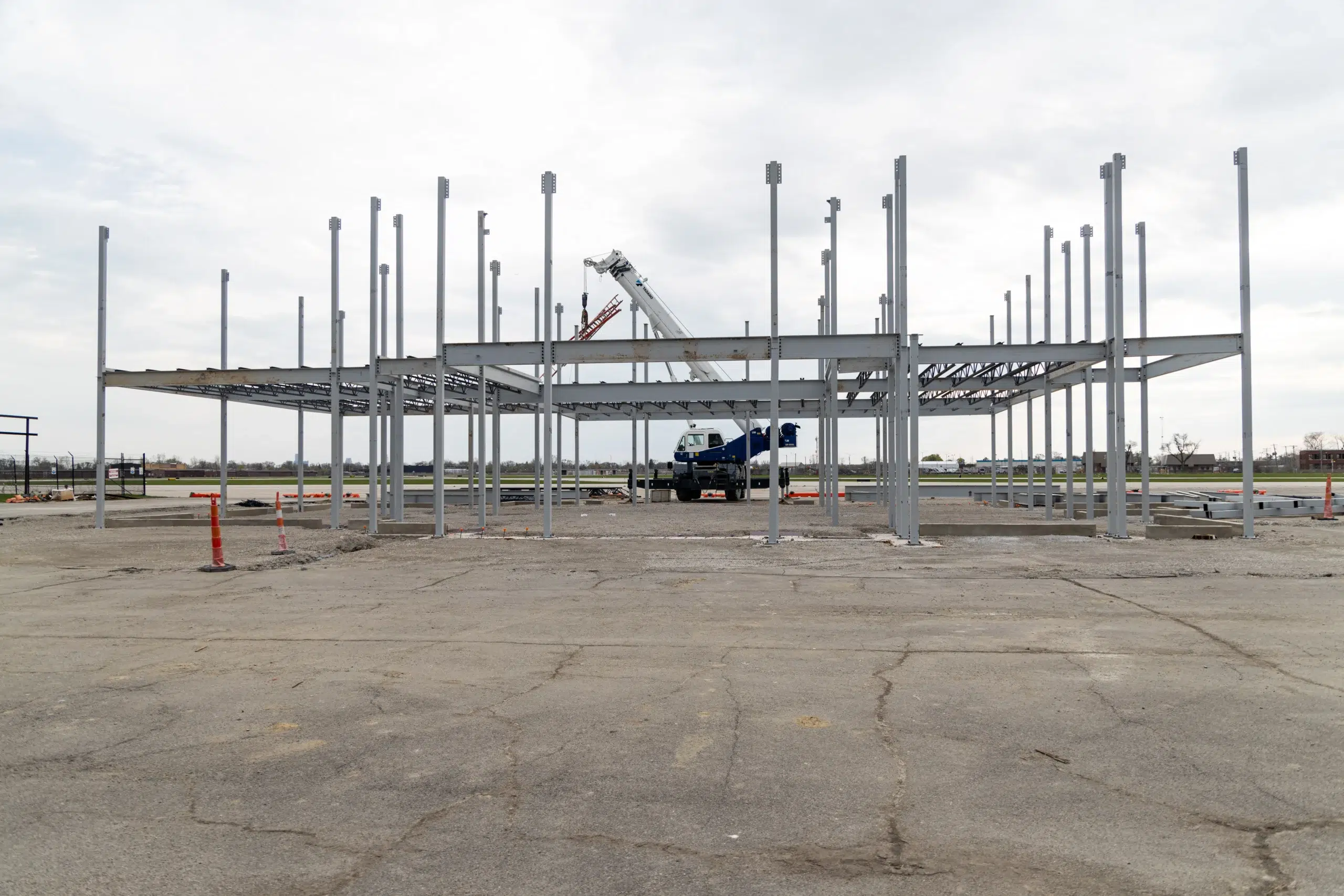 This phase focused on the structural steel framework for the MyFlight Tours new facility. Crews installed the vertical columns and main beams that form the building’s core structure and define the major spaces inside.