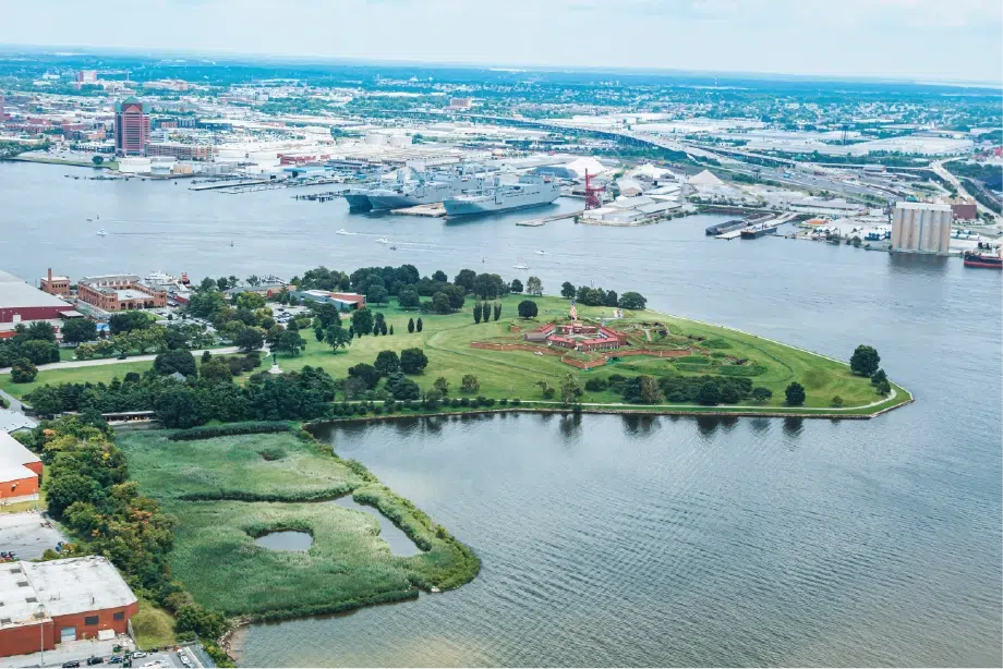 Spot the Fort McHenry's distinctive star shaped design from above, built to defend against enemy attack and a spectacular sight from the sky.